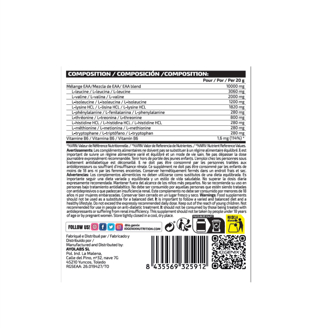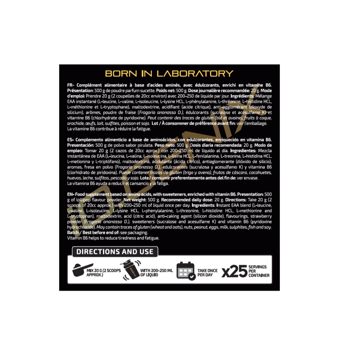 10 g d'EAA instantanés (les 9 essentiels dans des proportions optimales).