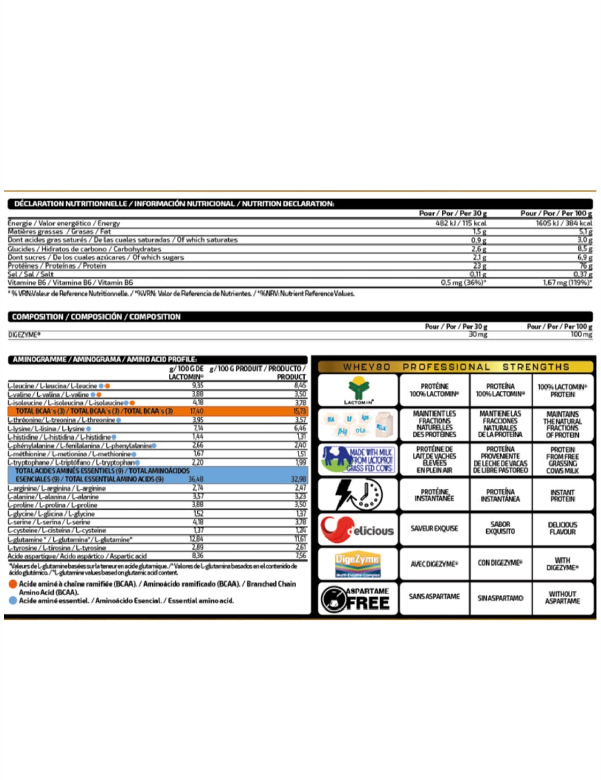 WHEY 80 PROFESSIONAL, l'un des meilleurs concentrés de protéines de lactosérum du marché, en combinant des matières premières de la plus haute qualité avec des arômes incroyables choisis par notre équipe d'experts. En plus de transporter le complexe multi-enzymes Digezyme® et la vitamine B6 pour en faire l'une des protéines WHEY les plus complètes d'aujourd'hui.